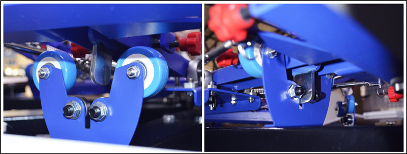 4. Each screen frame’s fixing device is equipped wth precise positioning wheel,when the positioning iron on the arm placed in positioning wheel closely, it can ensure the printing precision