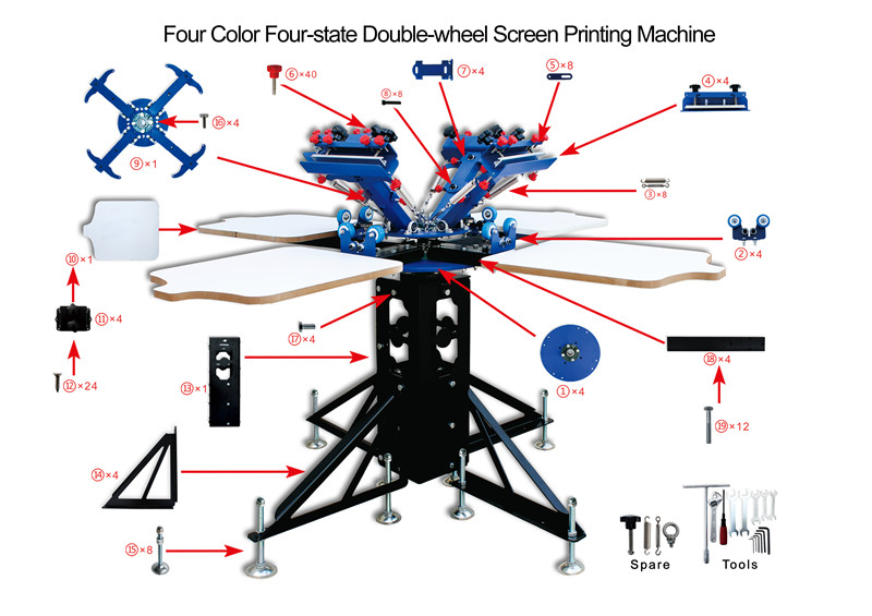 It is mainly used for the four color T-shirt overprinting,it is configured with four screen frame chucks and four t-shirt pallet stations;