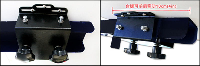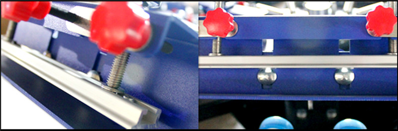 3. Each screen frame fixing device is configured with eight micro adjust knobs. By using the knobs ,user can micro adjust the screen frame from front to back , from left to right .It can make the overprinting more simple and more accurate.