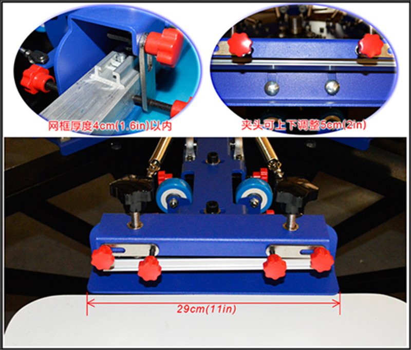 6. Each screen frame’s fixing device is equipped wth adjustable height chuck positioning knobs and adjustable height knobs when lift up the acreen frame ;